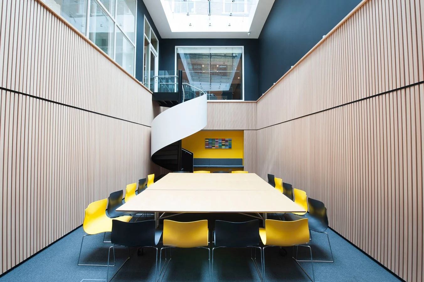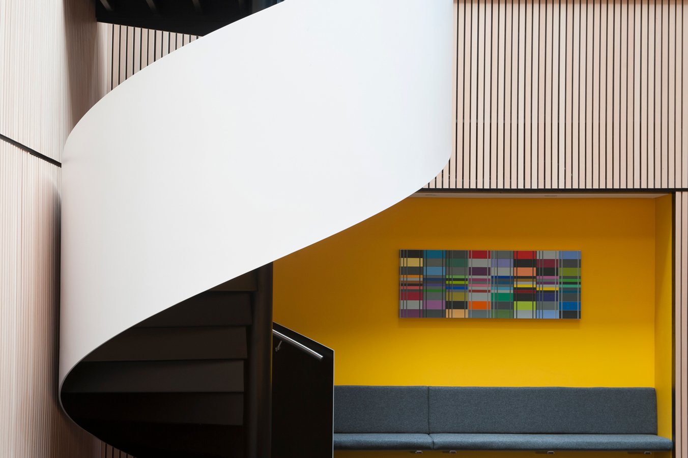 The centre piece of the project is the renovation of a double height atrium that was previously underused. This has been lined with timber acoustic panels to improve noise control and includes a sculptural spiral staircase.