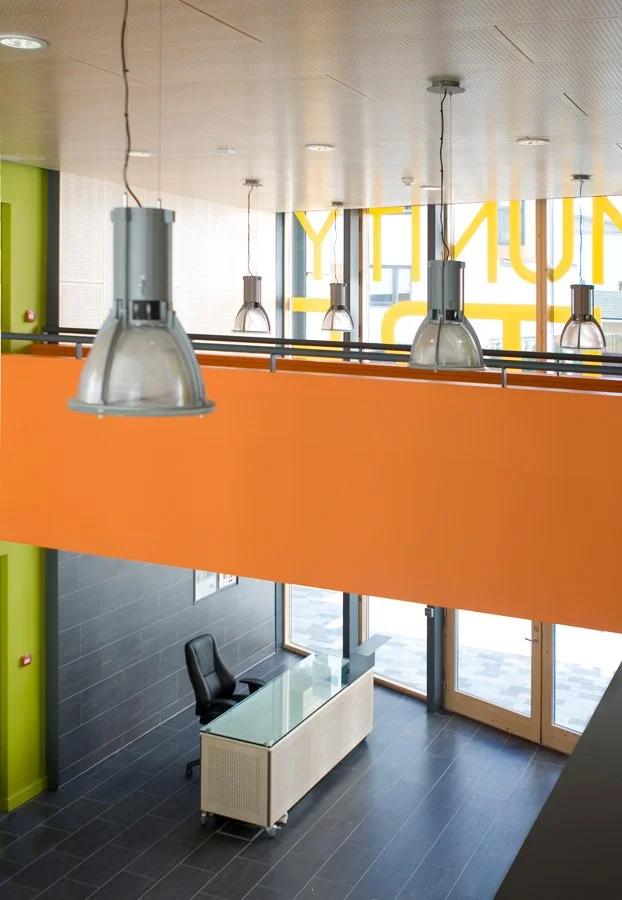 A purpose built community centre is at the centre of the strip controlling access to a resident only planted courtyard and rooftop sports pitch. The community centre has a glazed double height entrance space which can be used as an informal community cafe. An upper level mezzanine overlooks the entrance space and during the day becomes a training facility transforming into a youth club in the evening with a sound proofed music room recording studio. The top floor contains a flexible meeting and activity space together with a related outdoor roof terrace, kitchens and a changing area for those using the sports roof.